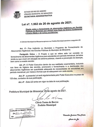 Segundo informação disponível no site da Câmara de Vereadores de Miracema, a lei n. 1962, de 26 de agosto de 2021, que dispõe sobre a distribuição de absorventes higiênicos nas escolas públicas municipais é de autoria do vereador Jocimar Freire.