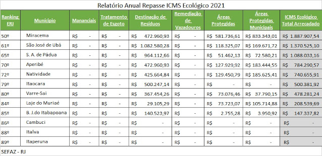 O blogueiro Hélcio Menezes divulgou hoje os valores repassados aos municípios do noroeste fluminense pelo ICMS Verde (ano-base 2019, ano-fiscal 2021).